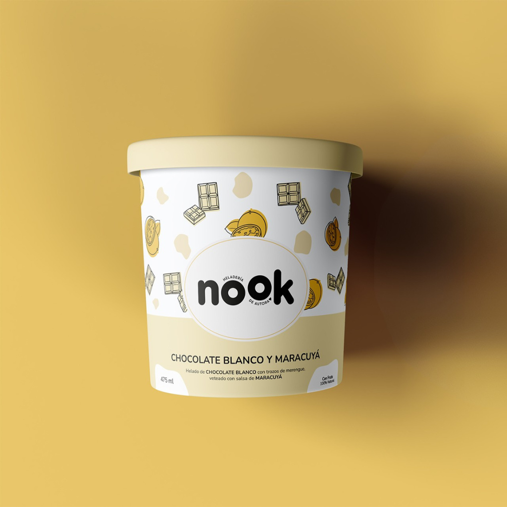Pote de 475 ml con Helado de Chocolate Blanco con una deliciosa salsa de maracuyá y trocitos de merengue.